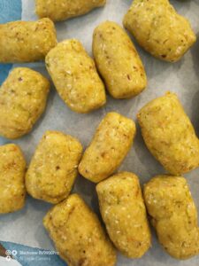 שוקלים 20 גרם מתערובת הפירורים דוחסים טיפה בידיים לצורת כדור (מומלץ ללוש את הכדור כמה שפחות כי העיבוד מקשה את העוגיות הסופיות).