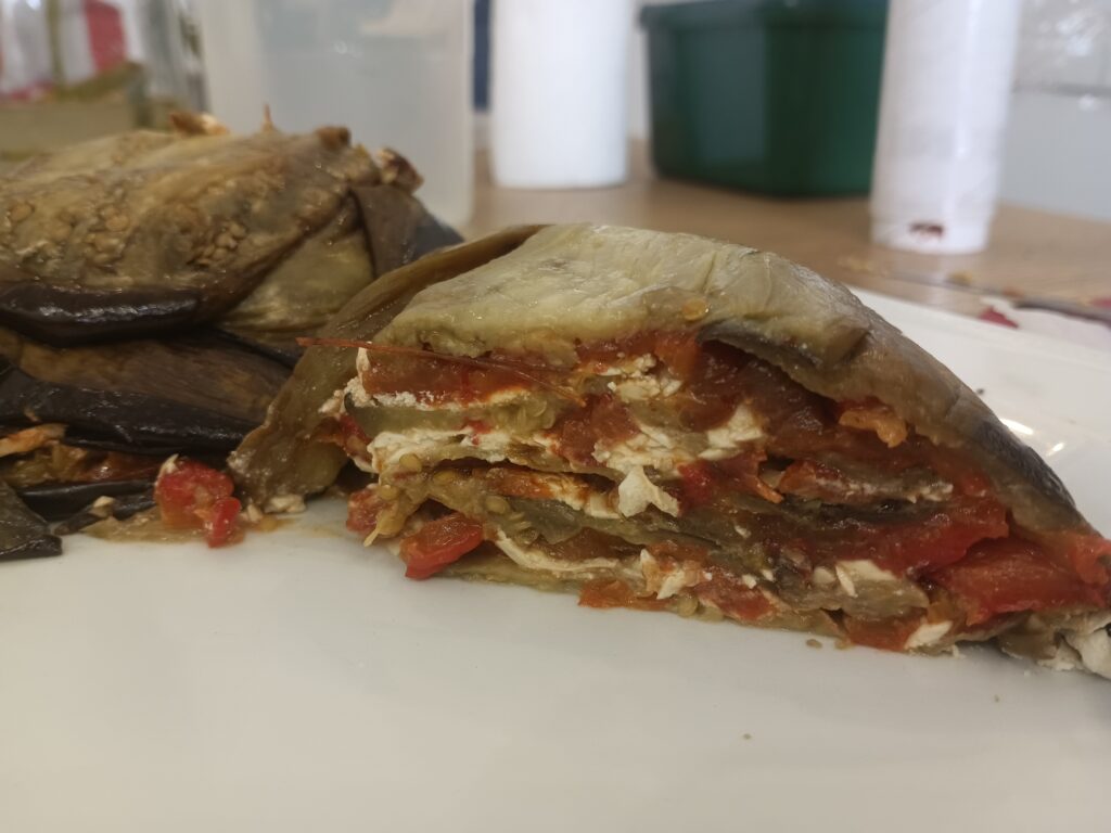 חוזרים על התהליך עם יתרת החציל והפלפלים, מסיימים בשכבת פרוסות חצילים.