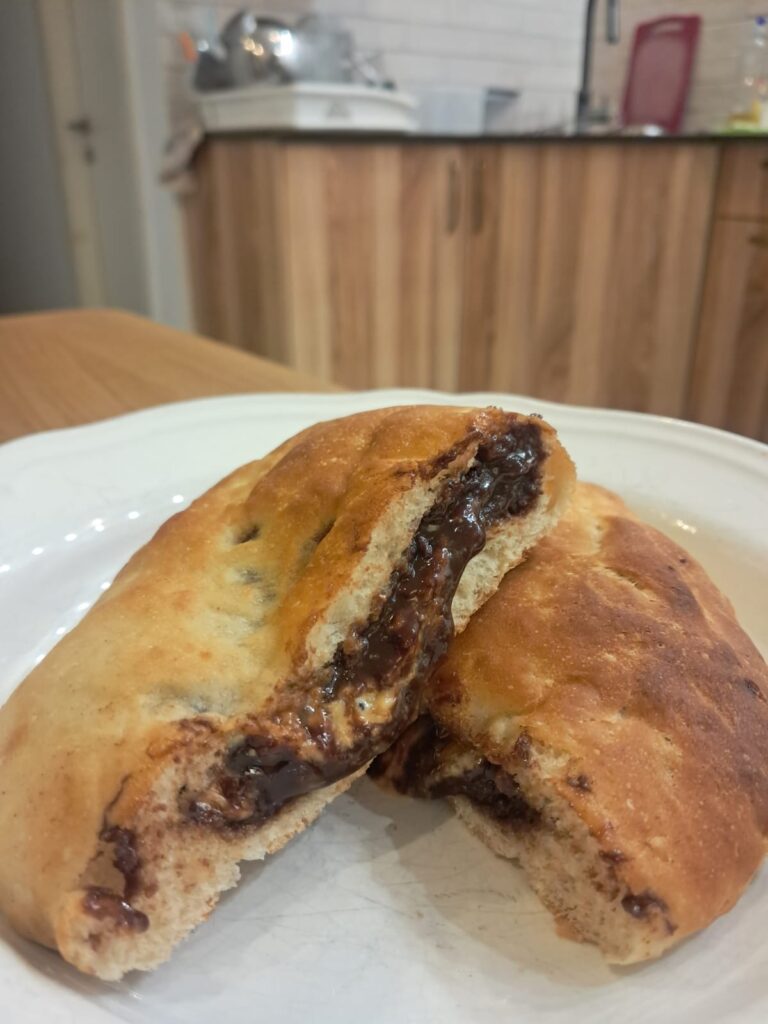 הקטע פה זה שמכינים בצק לפיצה, לוקחים חלק ממנו וממלאים אותו במלית שוקולד קלה להכנה ומושחטת!
